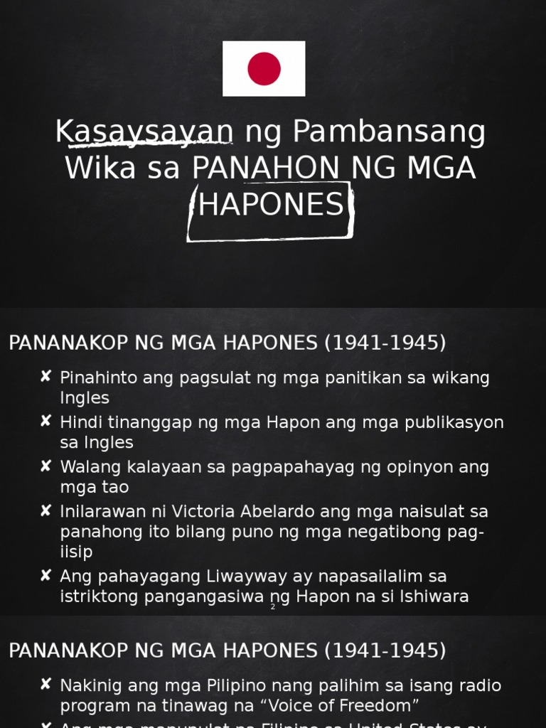 Kasaysayan ng wikang pambansa sa panahon ng hapon slideshare. Sa modernong panahon nahaluan. Kasaysayan ng wikang pambansa sa panahon ng hapones by dona_fortes. Hunyo 7 1940 -Pinagtibay ng Batas-Komonwelt Blg.