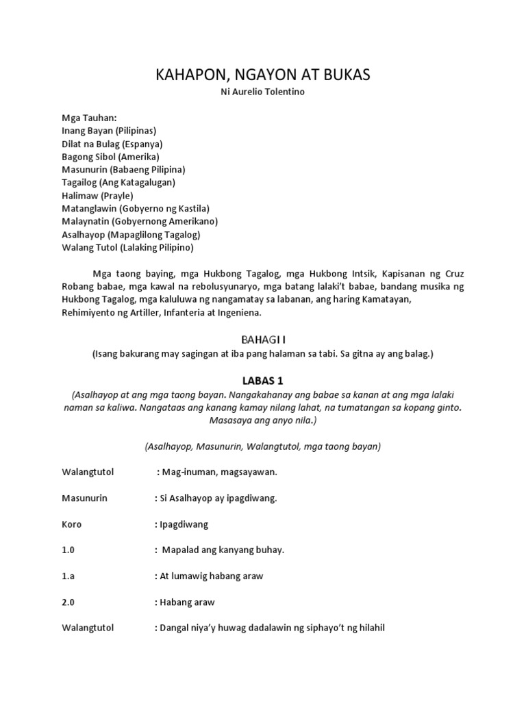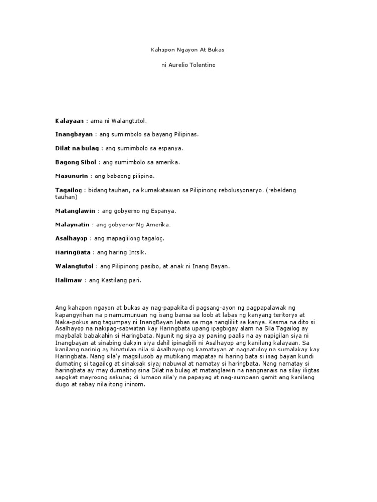Mamaya ang hindi ginagawa ito. Dula ng Himagsikan MGA TAUHAN INANGBAYAN PILIPINAS DILAT NA BULAG ESPANYA BAGONGSIBOL AMERIKA MASUNURIN BABAING PILIPINA TAGAILOGANG KATAGALUGAN MATANGLAWIN GOBYERNO NG. KAHAPON NGAYON AT BUKAS Ni Aurelio Tolentino BUOD Nasilaw sa kislap ng salapi ay isinuplong ni Asal Hayop Mapaglilong Tagalog ang kanyang Inang Bayan Filipinas at ang kanyan kapatid na si Tagailog Katagalugan.