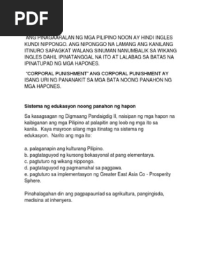 22Noong panahon ng mga Kastila ang mga pilipino ay nakaranas ng kahirapan sa edukasyon sapagkat naging ekslusibo lamang ito sa mga may kayang pamilya. Corporal punishment ang corporal punishment ay isang uri ng pananakit sa mga bata noong panahon ng mga hapones. 6Sa Hapon ang edukasyon ay kompulsoryo sa mga antas na elemantarya at.