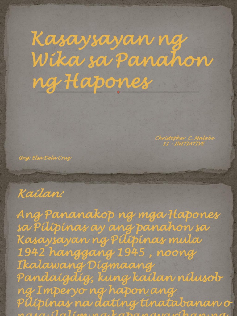 Panahon ng hapones sa pilipinas wika. Kasaysayan ng wikang Filipino. Ang wikang Ingles nanakuhang maipasok ng mga Amerikano hanggang sa kamalayan ng mga Pilipino ay ipinagbawal gamitin ng mga Hapones kung kayat ang nagtamasa ng bunga ng pagbabawal na ito ay ang panitikang Pilipino sa wikang Tagalog. Pilipino-sa-panahon-ng-haponuncategorized-presentation-mOvvL4mrOO Haiku Ang ay isang uri ng tula na kinahumalingan ng mga Hapones na napasa naman sa mga Pilipino.