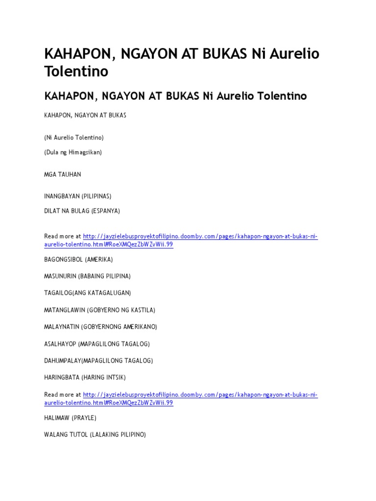KAHAPON NGAYON AT BUKAS Ni Aurelio Tolentino BUOD Nasilaw sa kislap ng salapi ay isinuplong ni Asal Hayop Mapaglilong Tagalog ang kanyang Inang Bayan Filipinas at ang kanyan kapatid na si Tagailog Katagalugan. ANG KOPYANG ITO AY HINDI IPINAGBIBILI. Tolentino ay muling inilathala at libreng ipinamamahagi ng KWF ang kopyang digital ng kaniyang tanyag na Kahapon Ngayon at Bkas.